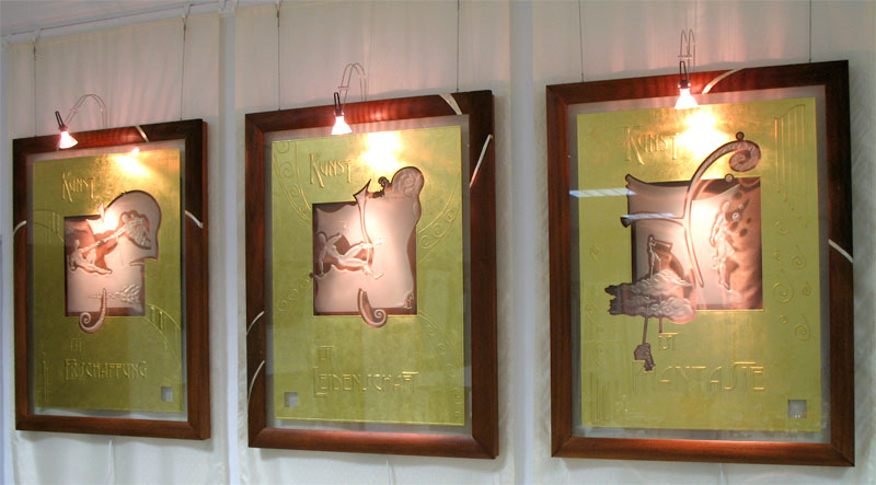 Having brought the three-dimensional deep sandblasting to perfection he has got a variety of possibilities at his disposal when it comes to sculpting in flat glass. This scope for design can otherwise only be found in the classical sculpting using stone or wood. His grandfather as well as his father practiced the classical art of painting. Thus characteristic features acquired by 3 generations are integrated in his compositions in a well-directed way.